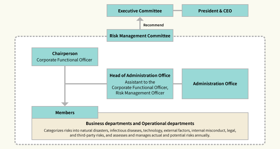 To ensure risk management across the Company, we have established the Risk Management Committee, which conducts risk assessments of individual matters in relation to specific types of risk and, as necessary, reviews internal systems.